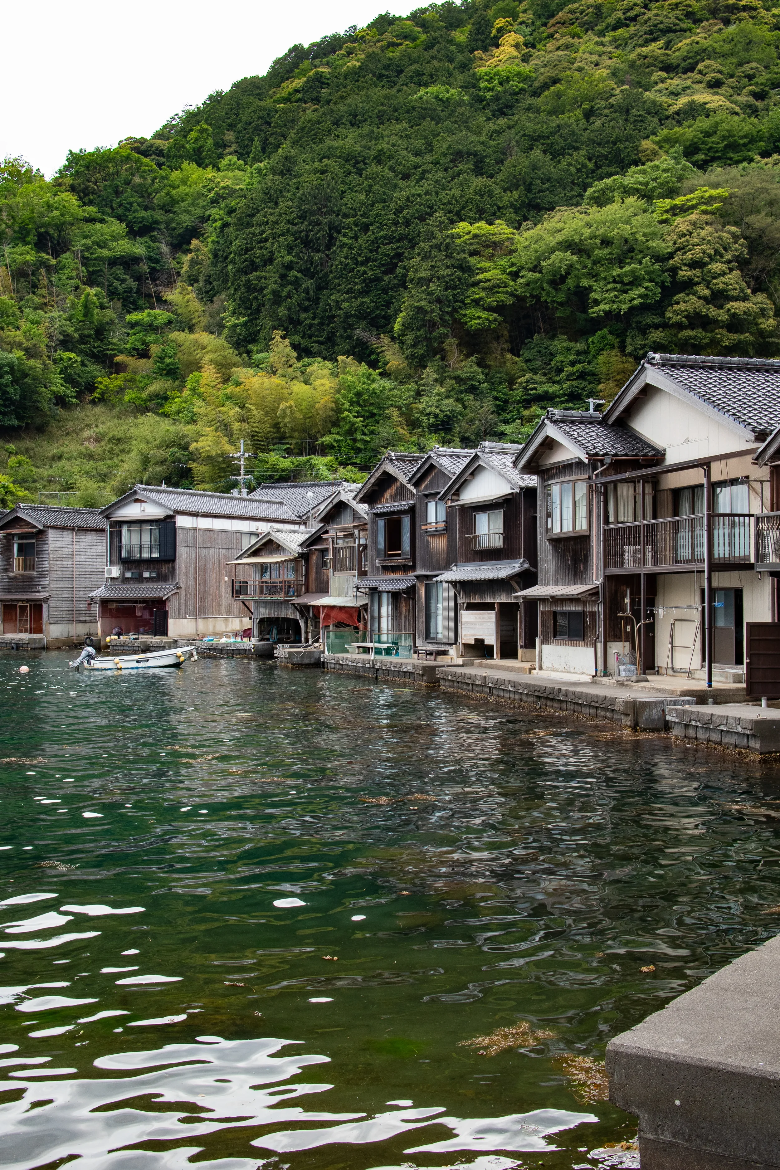 It's a string of funaya—two-story boathouses where the ground floor is a garage for their boat and the second floor is the living quarters—all sitting right on the water's edge.